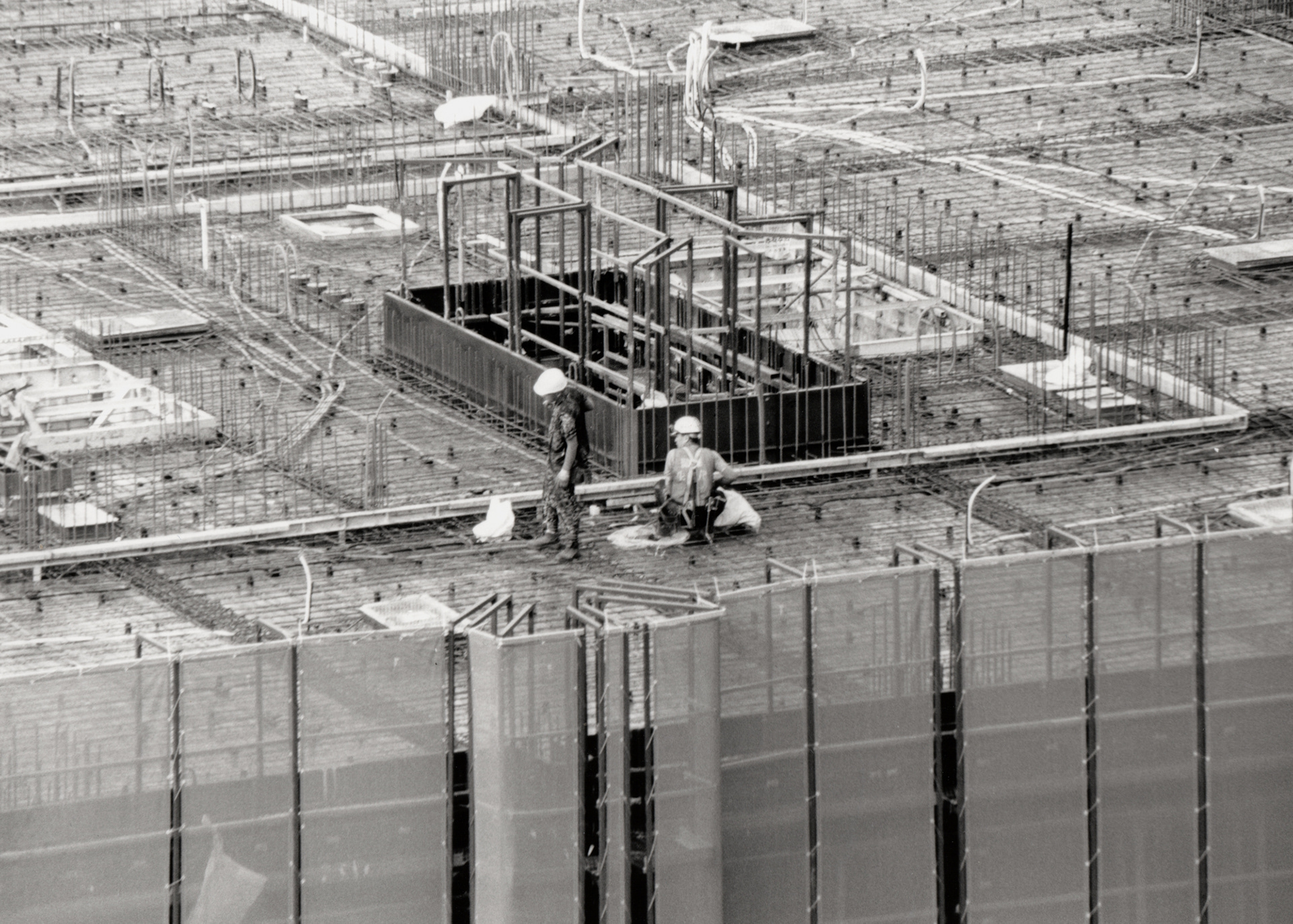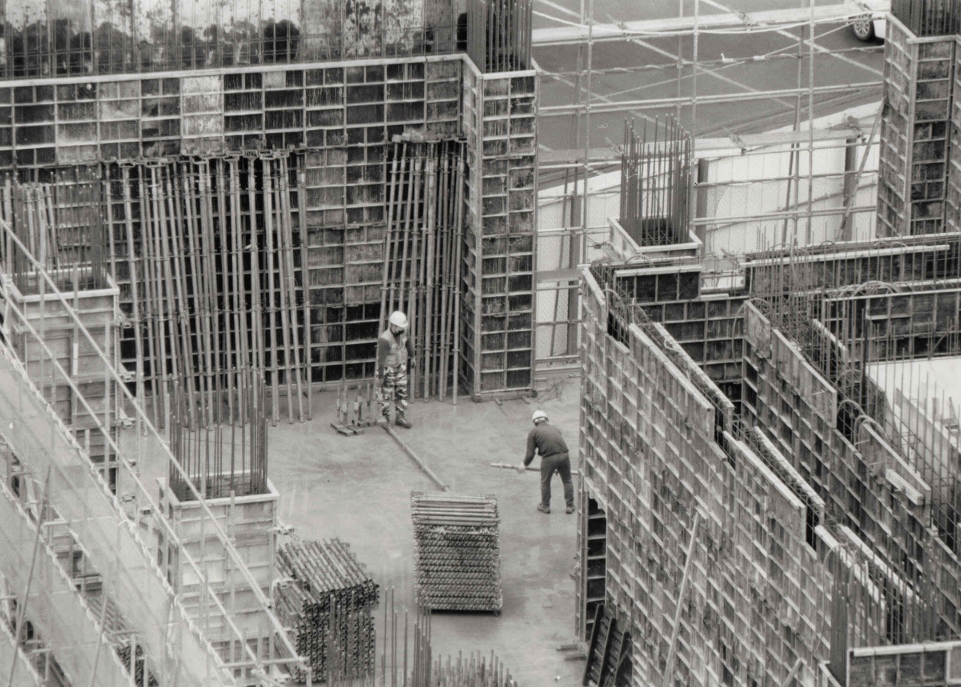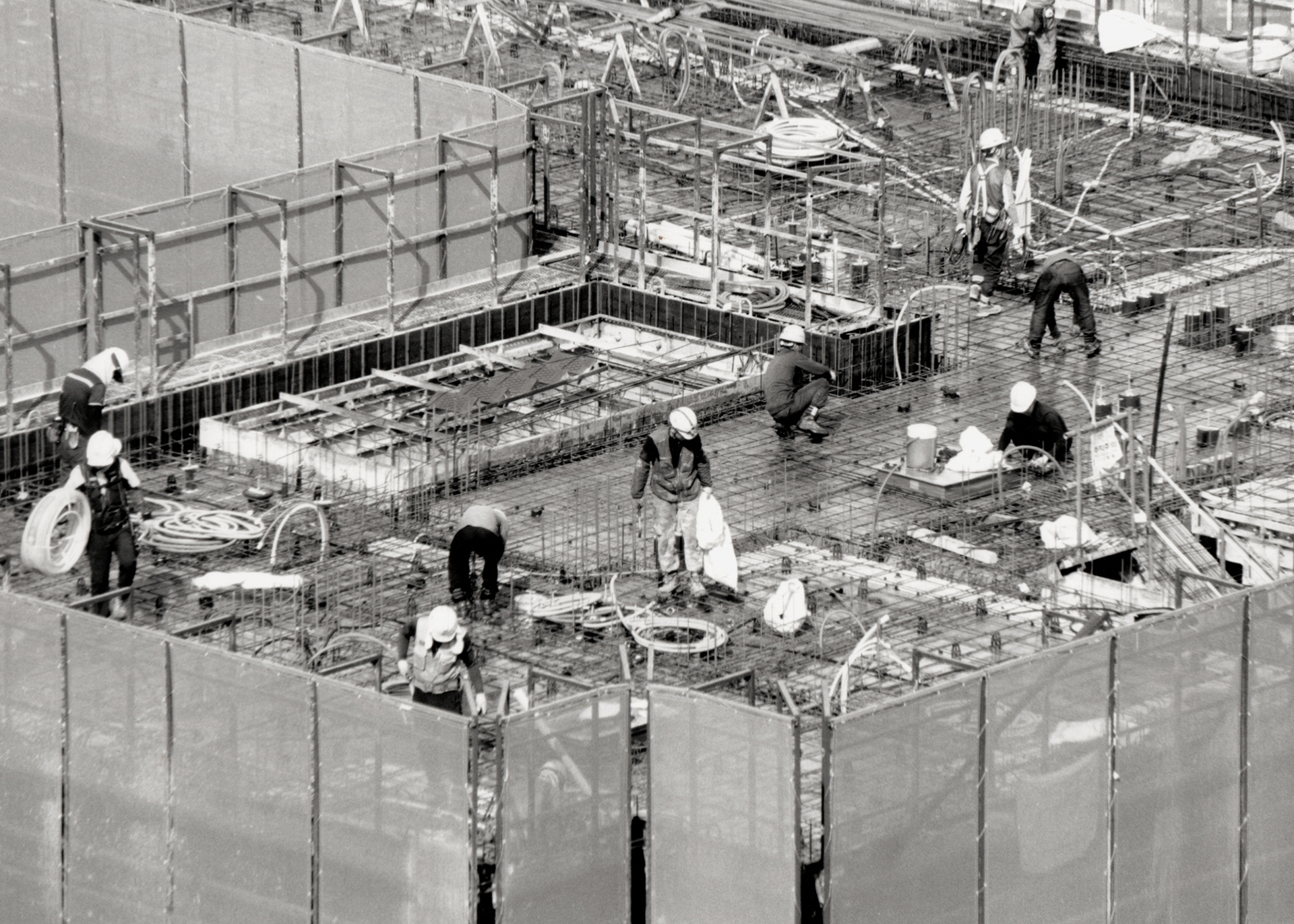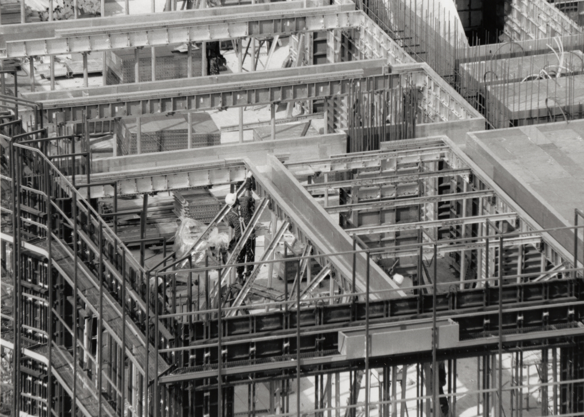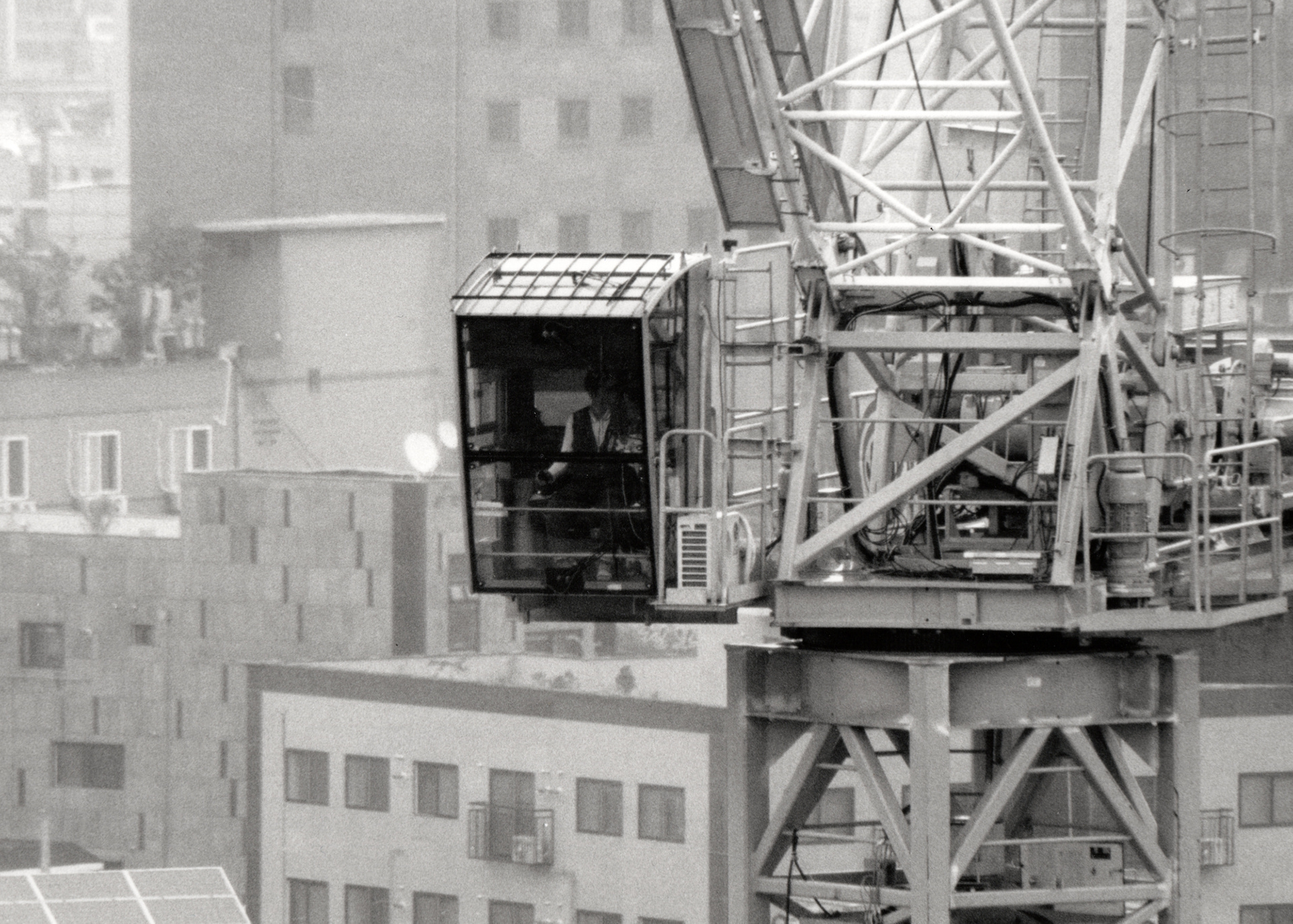 공사장의 하얀 벽은 도시 풍경 속의 작은 균열이자 단절이다. 그 너머에서 일하는 사람들은 작아지고, 움직임은 어딘가 비현실적이다. 콘크리트의 거대한 골조들 사이로 가늘게 걸린 철근과 기계들이 복잡하게 얽혀 있는 모습은 마치 도시의 골격을 드러내는 X-레이처럼 보인다.